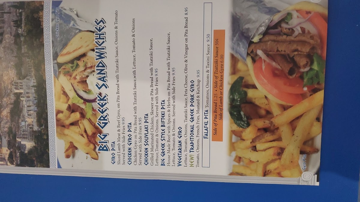 House made beef with spices and herbs on pita bread with tzatziki sauce, lettuce, tomato and onions. served with side fries.
